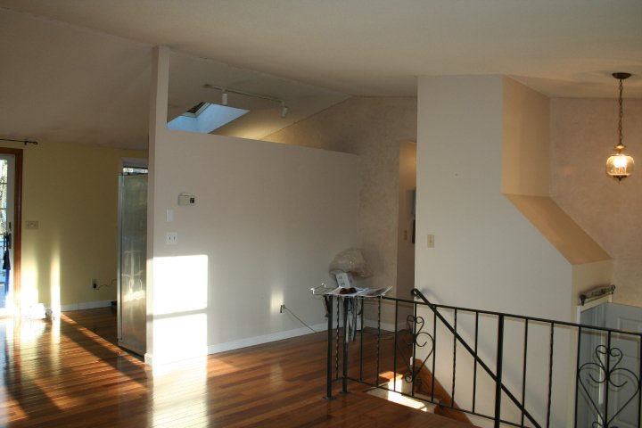Kitchen ceiling before re-vaulting in above picture.Shows 3/4 wall to be removed with support post supporting vaulted ceiling.