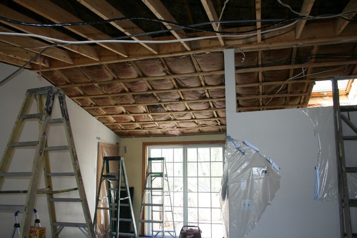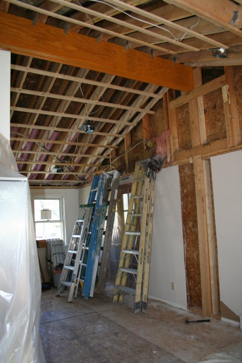Below picture shows removed walls and newly vaulted ceiling with center laminated carrier beam.