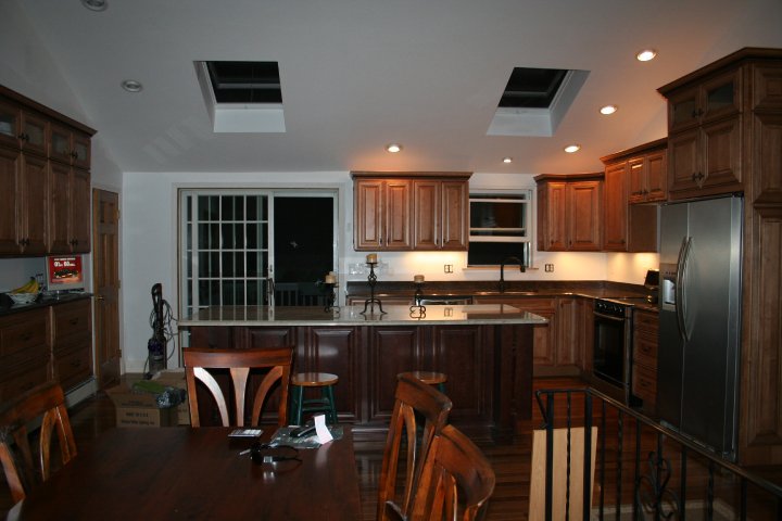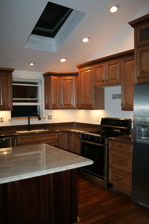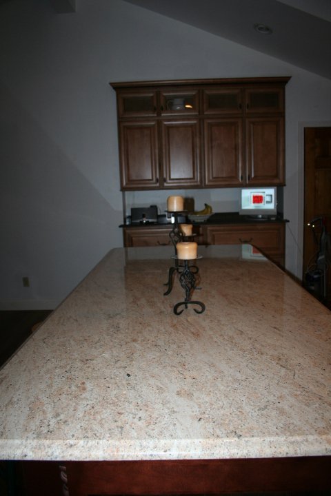 Below is a picture of the new kitchen. The home owner chose two different granite tops to accent the opposing colored cabinetry